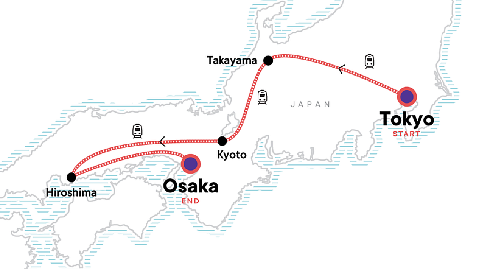 - Transferfahrten mit verschiedenen Transportmitteln vor Ort: Lokalzug, Shinkansen, Bus, Fähre, zu Fuß.
