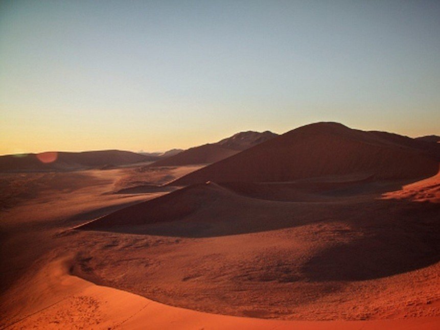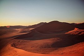 Früh am Morgen brecht ihr auf zum Campingplatz in Sossusvlei - dem Tor zur Namib-Wüste mit ihren imposantenn roten Sanddünen. Am Nachmittag erkundet ihr die Landschaften rund um die Salz-Ton-Pfanne von Sossuvlei, umgeben von den höchsten Dünen der Welt - einige ragen bis zu 300 Meter in die Höhe. Wer möchte kann die berühmte Düne 45 erklimmen oder bei einem optionalen geführten Spaziergang mehr über die Naturwunder der Region erfahren. Alternativ bleibt Zeit, um die Gegend auf eigene Faust zu entdecken.