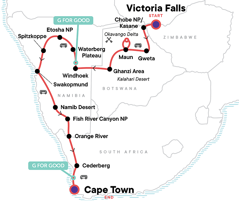 Wenn ihr die Farben, die Kultur und die Landschaft dieser unglaublichen Region so richtig aufsaugen möchtet, ist diese Expedition nach Südwest-Afrika optimal. Erlebe Pirschfahrten, hinterlasse deine Fußspuren in den höchsten Sanddünen der Welt, bewundere die atemberaubenden Victoria-Wasserfälle und fahre mit dem Kanu durch Deltas, in denen es von Wildtieren wimmelt.